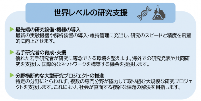 これらの分野に限定されることなく、大学全体の活力を高めるために、皆様のご寄附を柔軟かつ効果的に活用させていただきます。