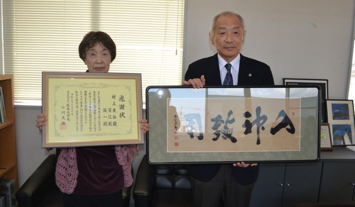 村上百江様は、平成元年に工学部をご卒業され、平成3年に大学院をご修了された村上誠一様のお母様でいらっしゃいます。