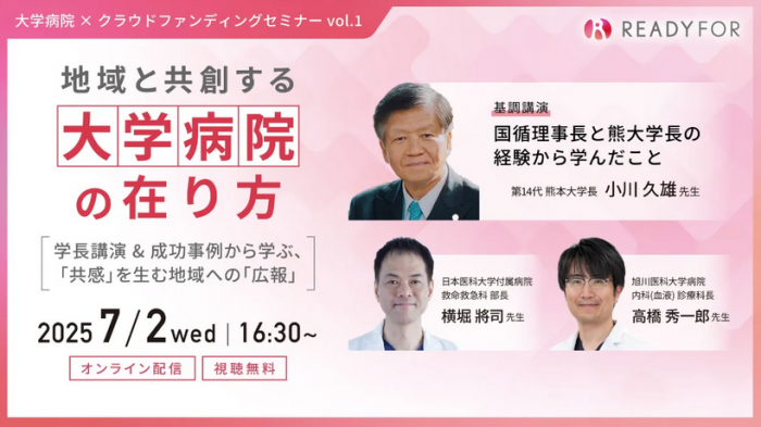 2025年7月2日(水)にREADYFOR主催 オンラインセミナー「地域と共創する 大学病院の在り方 ―学長講演&成功事例から学ぶ『共感』を生む地域への『広報』―」の基調講演に小川学長が登壇しました。国立研究開発法人の理事長および国立大学の学長の経験をもとに、組織経営の現状・課題、今後の挑戦について講演しました。
